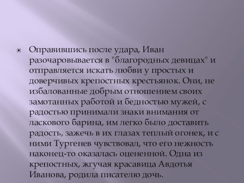 любви у простых и доверчивых крепостных крестьянок. Они, не избалованные добрым отношением своих замотанных работой и бедностью мужей, с радостью принимали знаки внимания от ласкового барина, им легко было доставить радость, зажечь в их глазах теплый огонек, и с ними Тургенев чувствовал, что его нежность наконец-то оказалась оцененной. Одна из крепостных, жгучая красавица Авдотья Иванова, родила писателю дочь.