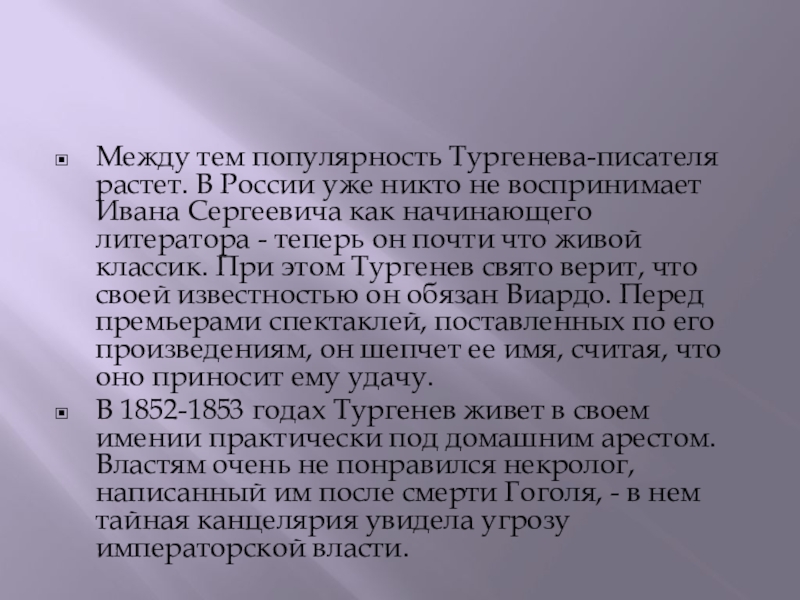 Ивана Сергеевича как начинающего литератора - теперь он почти что живой классик. При этом Тургенев свято верит, что своей известностью он обязан Виардо. Перед премьерами спектаклей, поставленных по его произведениям, он шепчет ее имя, считая, что оно приносит ему удачу.