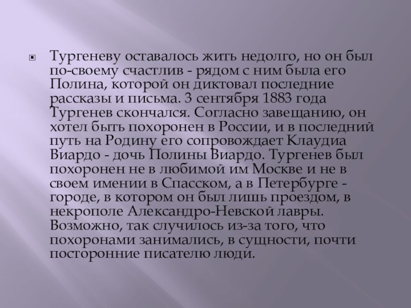с ним была его Полина, которой он диктовал последние рассказы и письма. 3 сентября 1883 года Тургенев скончался. Согласно завещанию, он хотел быть похоронен в России, и в последний путь на Родину его сопровождает Клаудиа Виардо - дочь Полины Виардо. Тургенев был похоронен не в любимой им Москве и не в своем имении в Спасском, а в Петербурге - городе, в котором он был лишь проездом, в некрополе Александро-Невской лавры. Возможно, так случилось из-за того, что похоронами занимались, в сущности, почти посторонние писателю люди.