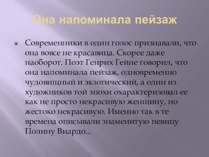 Слайд 4Действительно, внешность Виардо была далека от идеала. Она была сутула, с