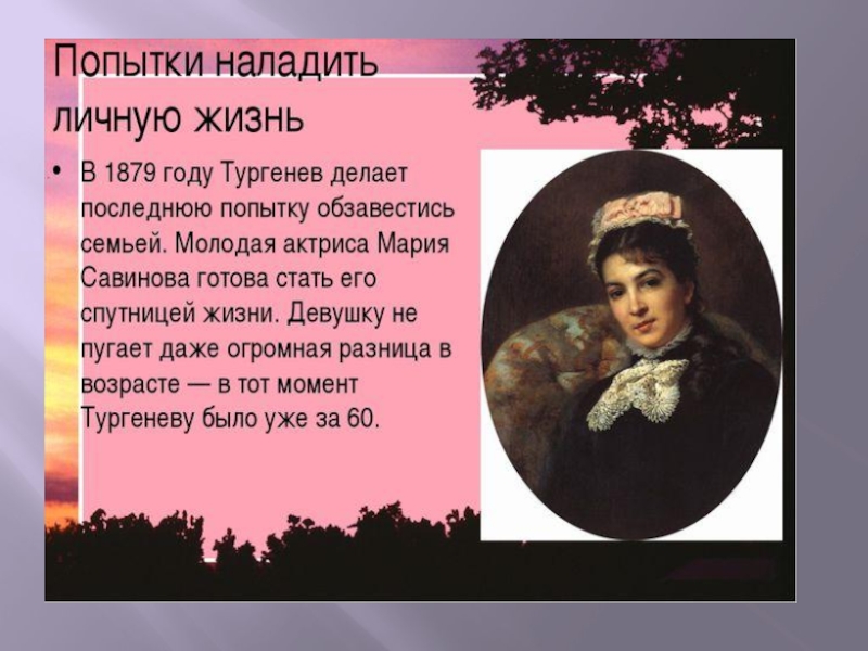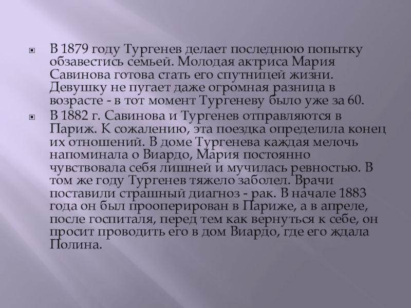 Слайд 21В 1879 году Тургенев делает последнюю попытку обзавестись семьей. Молодая актриса