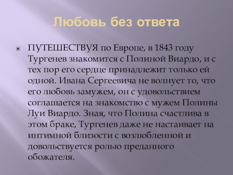 Полиной Виардо, и с тех пор его сердце принадлежит только ей одной. Ивана Сергеевича не волнует то, что его любовь замужем, он с удовольствием соглашается на знакомство с мужем Полины Луи Виардо. Зная, что Полина счастлива в этом браке, Тургенев даже не настаивает на интимной близости с возлюбленной и довольствуется ролью преданного обожателя.