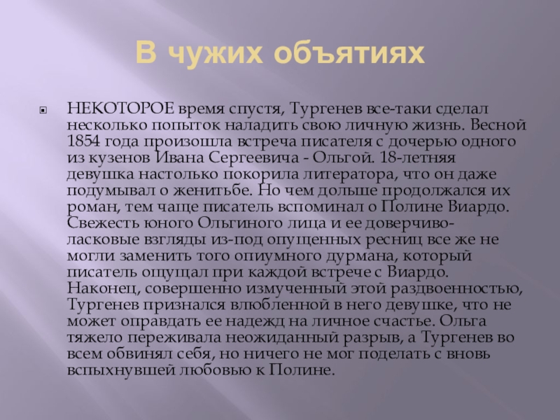 свою личную жизнь. Весной 1854 года произошла встреча писателя с дочерью одного из кузенов Ивана Сергеевича - Ольгой. 18-летняя девушка настолько покорила литератора, что он даже подумывал о женитьбе. Но чем дольше продолжался их роман, тем чаще писатель вспоминал о Полине Виардо. Свежесть юного Ольгиного лица и ее доверчиво-ласковые взгляды из-под опущенных ресниц все же не могли заменить того опиумного дурмана, который писатель ощущал при каждой встрече с Виардо. Наконец, совершенно измученный этой раздвоенностью, Тургенев признался влюбленной в него девушке, что не может оправдать ее надежд на личное счастье. Ольга тяжело переживала неожиданный разрыв, а Тургенев во всем обвинял себя, но ничего не мог поделать с вновь вспыхнувшей любовью к Полине.