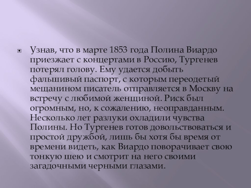в Россию, Тургенев потерял голову. Ему удается добыть фальшивый паспорт, с которым переодетый мещанином писатель отправляется в Москву на встречу с любимой женщиной. Риск был огромным, но, к сожалению, неоправданным. Несколько лет разлуки охладили чувства Полины. Но Тургенев готов довольствоваться и простой дружбой, лишь бы хотя бы время от времени видеть, как Виардо поворачивает свою тонкую шею и смотрит на него своими загадочными черными глазами.