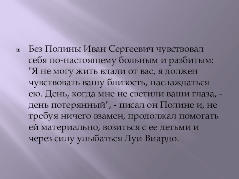 Слайд 15Без Полины Иван Сергеевич чувствовал себя по-настоящему больным и разбитым: "Я