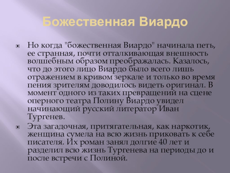 внешность волшебным образом преображалась. Казалось, что до этого лицо Виардо было всего лишь отражением в кривом зеркале и только во время пения зрителям доводилось видеть оригинал. В момент одного из таких превращений на сцене оперного театра Полину Виардо увидел начинающий русский литератор Иван Тургенев.