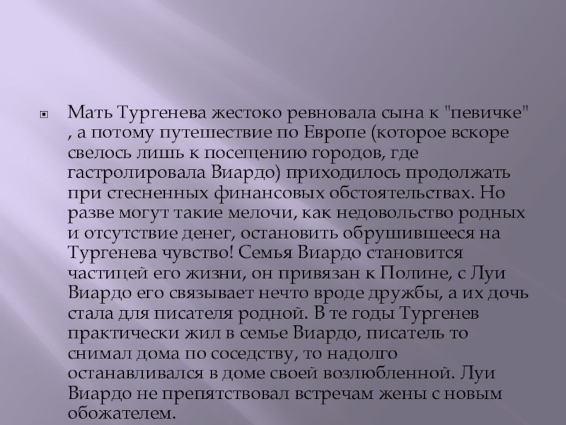 Слайд 13Мать Тургенева жестоко ревновала сына к "певичке" , а потому путешествие