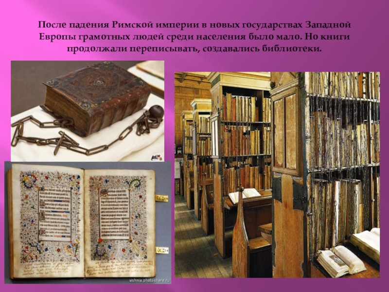 После падения Римской империи в новых государствах Западной Европы грамотных людей среди населения было мало. Но книги продолжали переписывать, создавались библиотеки.