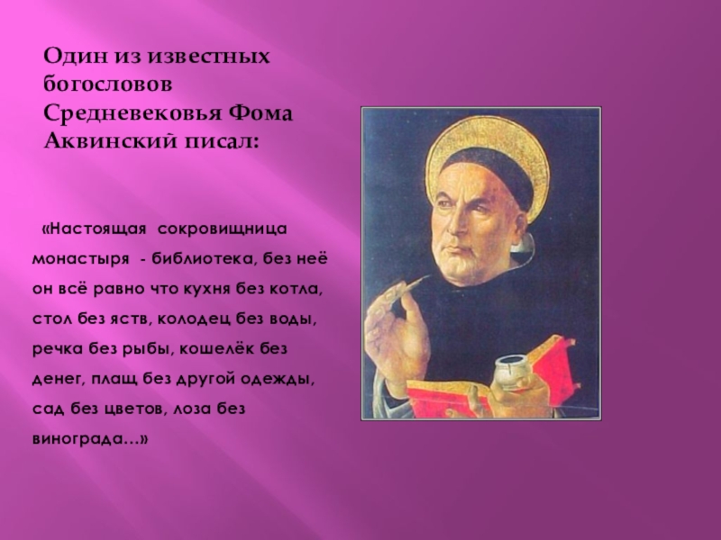 Один из известных богословов Средневековья Фома Аквинский писал:  «Настоящая сокровищница монастыря - библиотека, без неё он