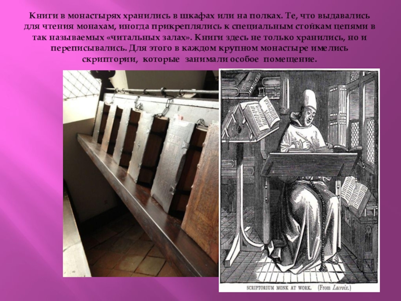 выдавались для чтения монахам, иногда прикреплялись к специальным стойкам цепями в так называемых «читальных залах». Книги здесь не только хранились, но и переписывались. Для этого в каждом крупном монастыре имелись скриптории, которые занимали особое помещение.