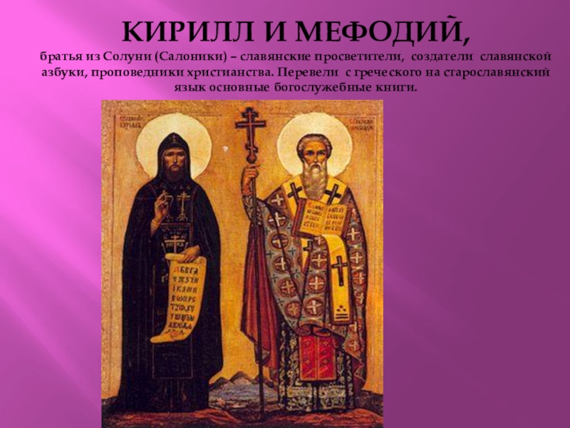 славянской азбуки, проповедники христианства. Перевели с греческого на старославянский язык основные богослужебные книги.