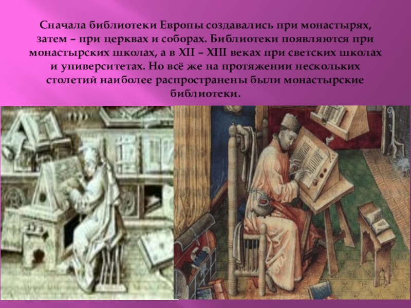 Сначала библиотеки Европы создавались при монастырях, затем – при церквах и соборах. Библиотеки появляются при монастырских школах,