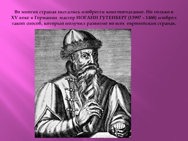 Во многих странах пытались изобрести книгопечатание. Но только в XV веке в Германии мастер ИОГАНН ГУТЕНБЕРГ (1399?