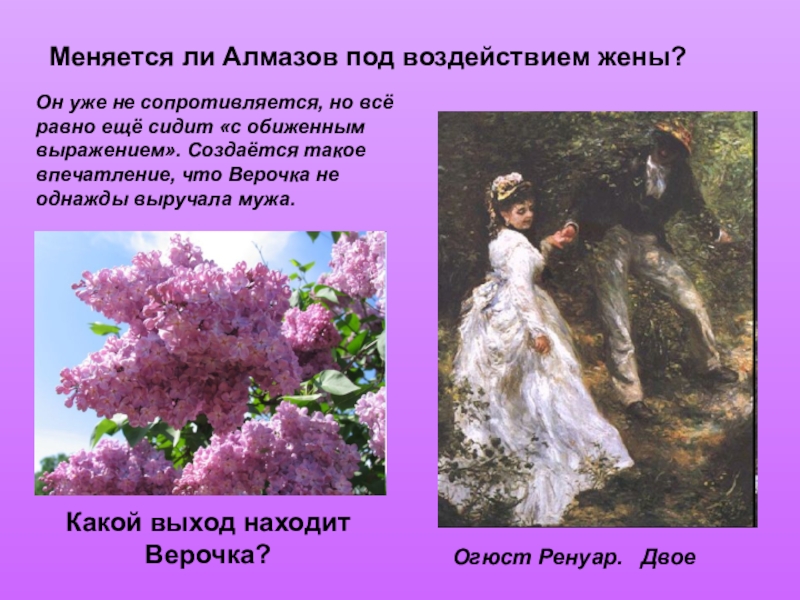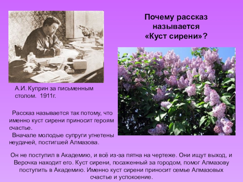 Он не поступил в Академию, и всё из-за пятна на чертеже. Они ищут выход, и Верочка находит его. Куст сирени, посаженный за городом, помог Алмазову поступить в Академию. Именно куст сирени приносит семье Алмазовых счастье и успокоение.