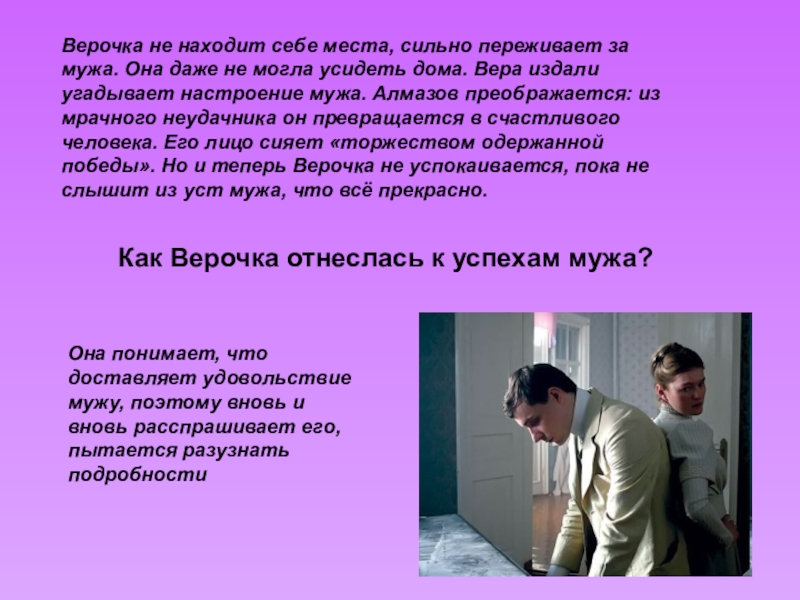 Она понимает, что доставляет удовольствие мужу, поэтому вновь и вновь расспрашивает его, пытается разузнать подробности