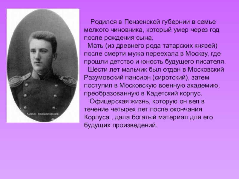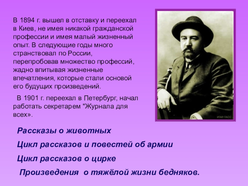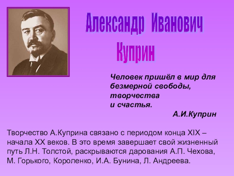 Творчество А.Куприна связано с периодом конца XIX – начала XX веков. В это время завершает свой жизненный путь Л.Н. Толстой, раскрываются дарования А.П. Чехова, М. Горького, Короленко, И.А. Бунина, Л. Андреева.