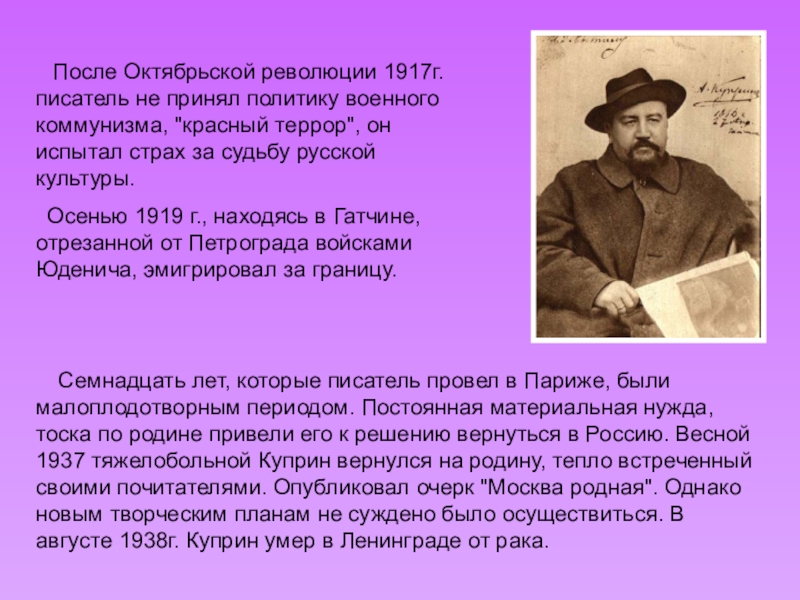После Октябрьской революции 1917г. писатель не принял политику военного коммунизма, "красный террор", он испытал страх за судьбу русской культуры.