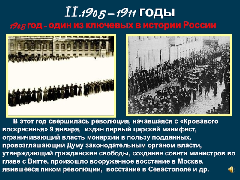 В этот год свершилась революция, начавшаяся с «Кровавого воскресенья» 9 января, издан первый царский манифест, ограничивающий власть монархии в пользу подданных, провозглашающий Думу законодательным органом власти, утверждающий гражданские свободы, создание совета министров во главе с Витте, произошло вооруженное восстание в Москве, явившееся пиком революции, восстание в Севастополе и др.