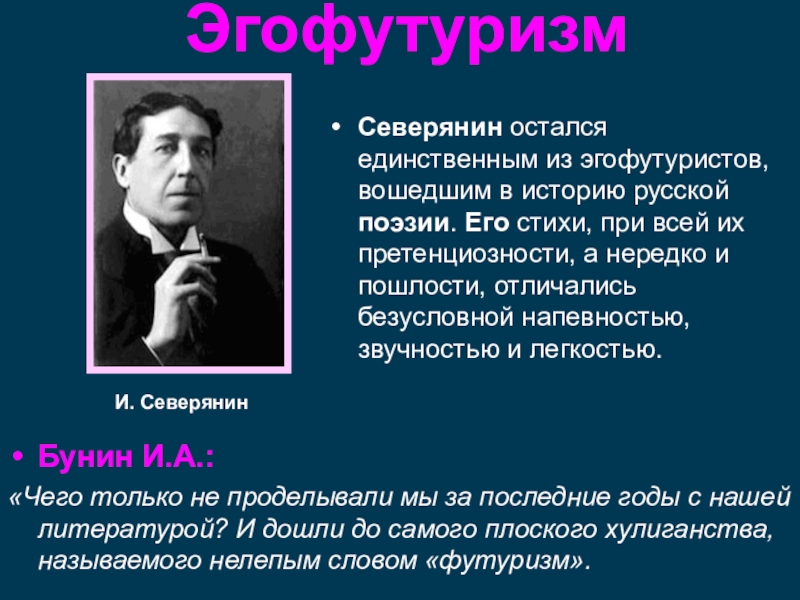 Северянин остался единственным из эгофутуристов, вошедшим в историю русской поэзии. Его стихи, при всей их претенциозности, а нередко и пошлости, отличались безусловной напевностью, звучностью и легкостью.