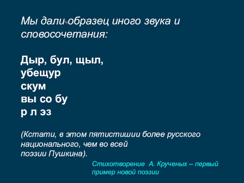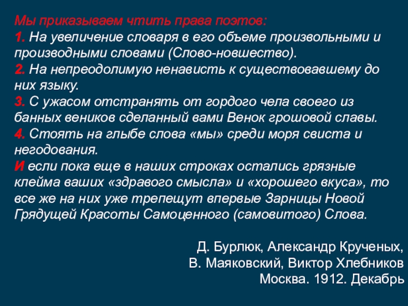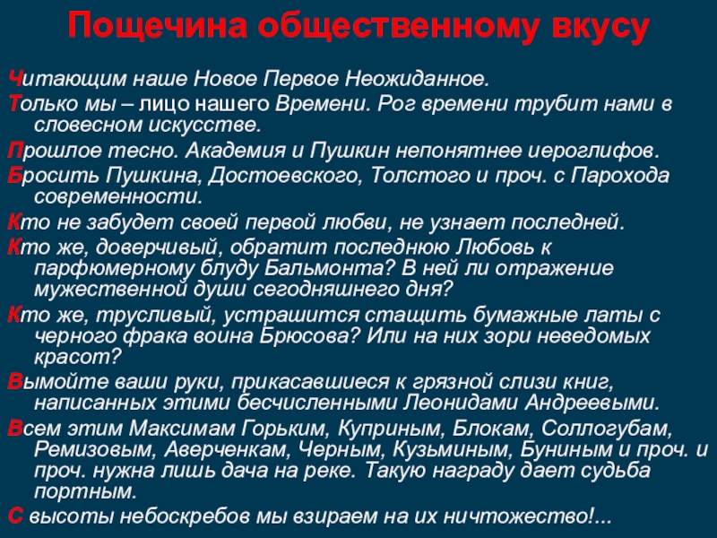«Прошлое тесно. Академия и Пушкин непонятнее иероглифов. Бросить Пушкина, Достоевского, Толстого и проч. с Парохода современности».