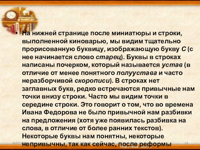 тщательно прорисованную буквицу, изображающую букву С (с нее начинается слово старец). Буквы в строках написаны почерком, который называется устав (в отличие от менее понятного полуустава и часто неразборчивой скорописи). В строках нет заглавных букв, редко встречаются привычные нам точки внизу строки. Часто мы видим точки в середине строки. Это говорит о том, что во времена Ивана Федорова не было привычной нам разбивки на предложения (хотя уже появилась разбивка на слова, в отличие от более ранних текстов). Некоторые буквы нам понятны, некоторые непривычны, так как сейчас, после реформы алфавита, мы ими не пользуемся.