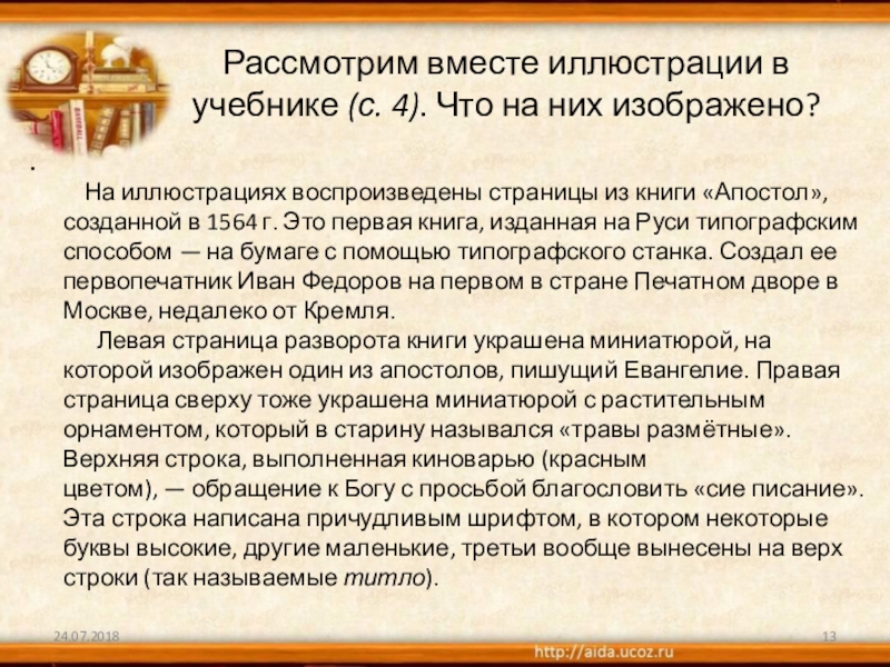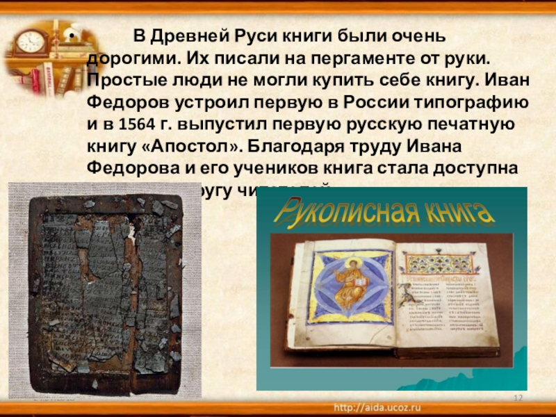 очень дорогими. Их писали на пергаменте от руки. Простые люди не могли купить себе книгу. Иван Федоров устроил первую в России типографию и в 1564 г. выпустил первую русскую печатную книгу «Апостол». Благодаря труду Ивана Федорова и его учеников книга стала доступна широкому кругу читателей.