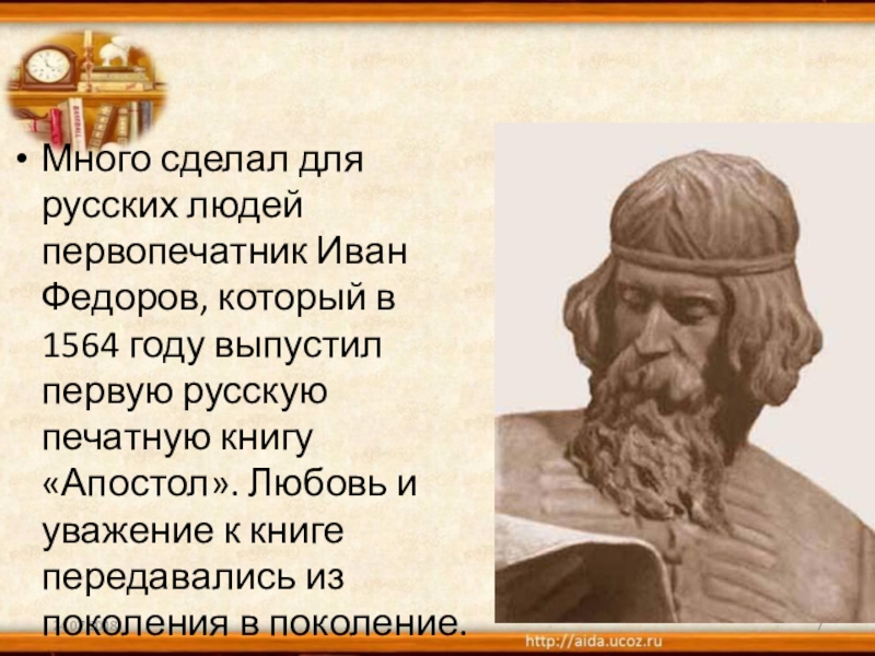выпустил первую русскую печатную книгу «Апостол». Любовь и уважение к книге передавались из поколения в поколение.