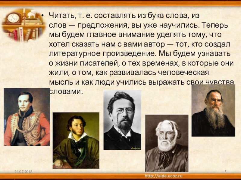 Теперь мы будем главное внимание уделять тому, что хотел сказать нам с вами автор — тот, кто создал литературное произведение. Мы будем узнавать о жизни писателей, о тех временах, в которые они жили, о том, как развивалась человеческая мысль и как люди учились выражать свои чувства словами.