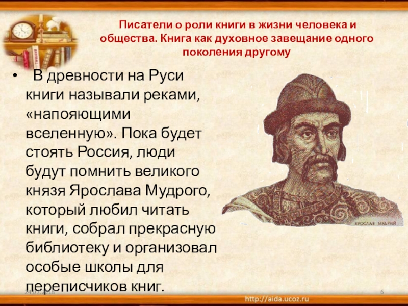 В древности на Руси книги называли реками, «напояющими вселенную». Пока будет стоять Россия, люди будут помнить великого князя Ярослава Мудрого, который любил читать книги, собрал прекрасную библиотеку и организовал особые школы для переписчиков книг.