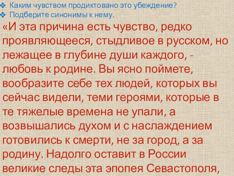 «Главное, отрадное убеждение, которое вы вынесли, - это убеждение в невозможности взять Севастополь, и не только взять Севастополь, но поколебать где бы то ни было силу русского народа.»