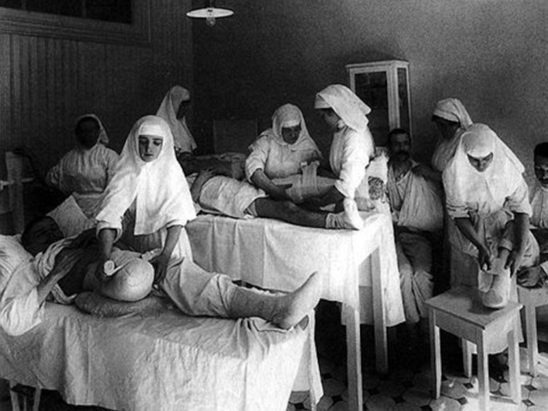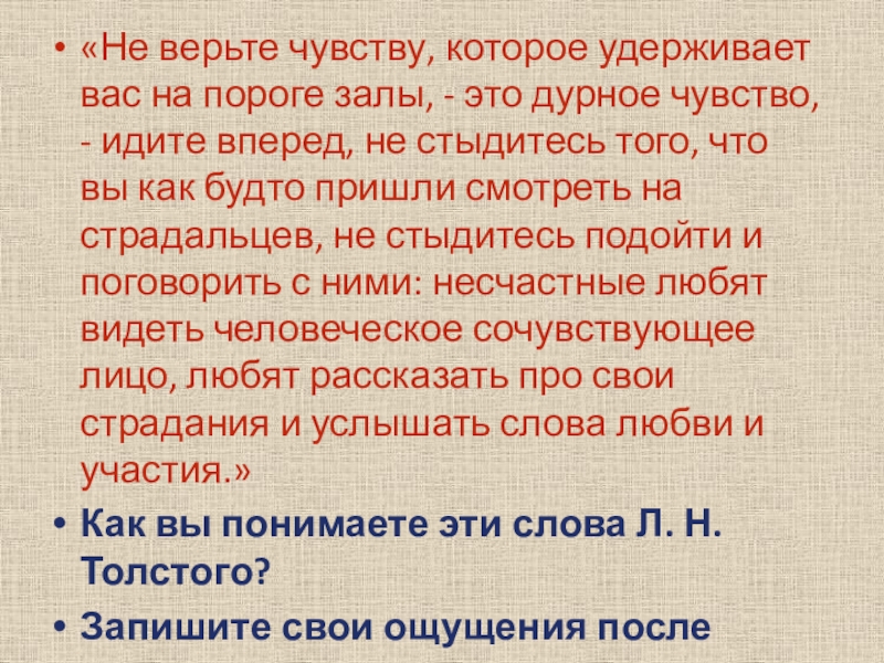«Но прежде чем сомневаться, сходите на бастионы, посмотрите защитников Севастополя на самом месте защиты или, лучше, зайдите прямо напротив в этот дом, бывший прежде Севастопольским собранием и на крыльце которого стоят солдаты с носилками, - вы увидите там защитников Севастополя, увидите там ужасные и грустные, великие и забавные, но изумительные, возвышающие душу зрелища.»