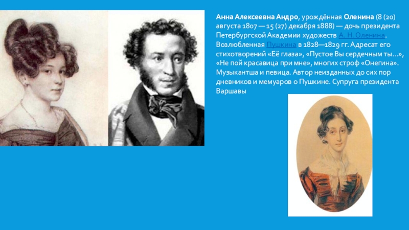 декабря 1888) — дочь президента Петербургской Академии художеств А. Н. Оленина. Возлюбленная Пушкина в 1828—1829 гг. Адресат его стихотворений «Её глаза», «Пустое Вы сердечным ты…», «Не пой красавица при мне», многих строф «Онегина». Музыкантша и певица. Автор неизданных до сих пор дневников и мемуаров о Пушкине. Супруга президента Варшавы