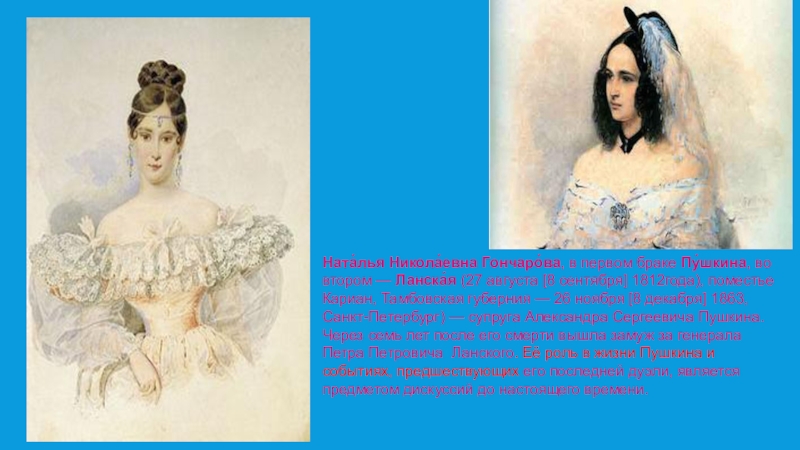 Слайд 13Ната́лья Никола́евна Гончаро́ва, в первом браке Пу́шкина, во втором — Ланска́я (27 августа