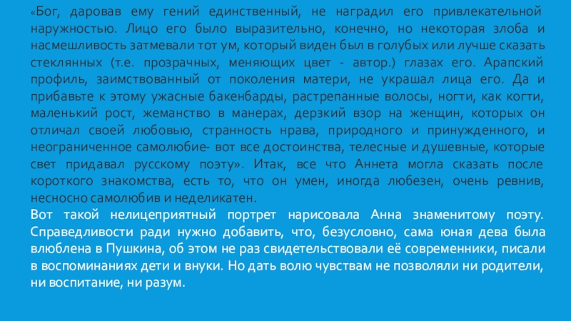 его было выразительно, конечно, но некоторая злоба и насмешливость затмевали тот ум, который виден был в голубых или лучше сказать стеклянных (т.е. прозрачных, меняющих цвет - автор.) глазах его. Арапский профиль, заимствованный от поколения матери, не украшал лица его. Да и прибавьте к этому ужасные бакенбарды, растрепанные волосы, ногти, как когти, маленький рост, жеманство в манерах, дерзкий взор на женщин, которых он отличал своей любовью, странность нрава, природного и принужденного, и неограниченное самолюбие- вот все достоинства, телесные и душевные, которые свет придавал русскому поэту». Итак, все что Аннета могла сказать после короткого знакомства, есть то, что он умен, иногда любезен, очень ревнив, несносно самолюбив и неделикатен.