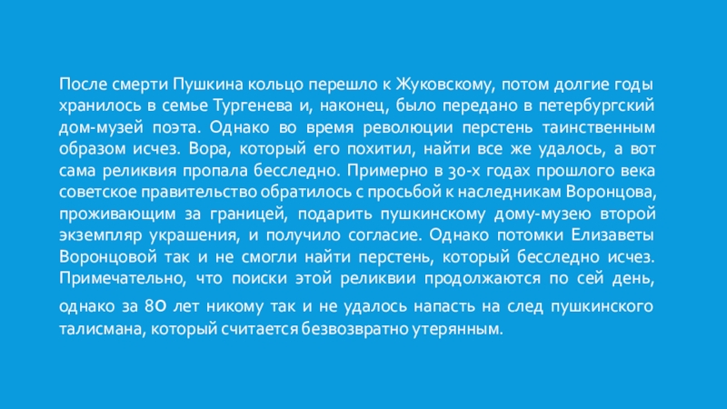 в семье Тургенева и, наконец, было передано в петербургский дом-музей поэта. Однако во время революции перстень таинственным образом исчез. Вора, который его похитил, найти все же удалось, а вот сама реликвия пропала бесследно. Примерно в 30-х годах прошлого века советское правительство обратилось с просьбой к наследникам Воронцова, проживающим за границей, подарить пушкинскому дому-музею второй экземпляр украшения, и получило согласие. Однако потомки Елизаветы Воронцовой так и не смогли найти перстень, который бесследно исчез. Примечательно, что поиски этой реликвии продолжаются по сей день, однако за 80 лет никому так и не удалось напасть на след пушкинского талисмана, который считается безвозвратно утерянным.
