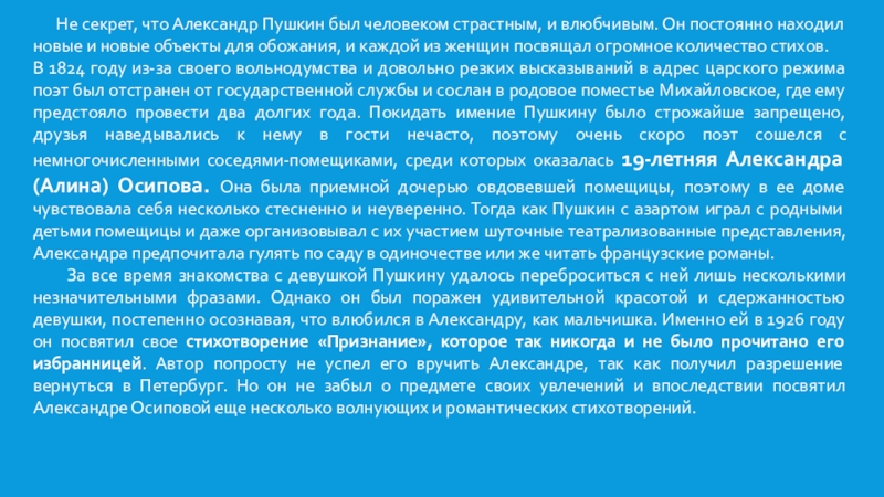 За все время знакомства с девушкой Пушкину удалось переброситься с ней лишь несколькими незначительными фразами. Однако он был поражен удивительной красотой и сдержанностью девушки, постепенно осознавая, что влюбился в Александру, как мальчишка. Именно ей в 1926 году он посвятил свое стихотворение «Признание», которое так никогда и не было прочитано его избранницей. Автор попросту не успел его вручить Александре, так как получил разрешение вернуться в Петербург. Но он не забыл о предмете своих увлечений и впоследствии посвятил Александре Осиповой еще несколько волнующих и романтических стихотворений.