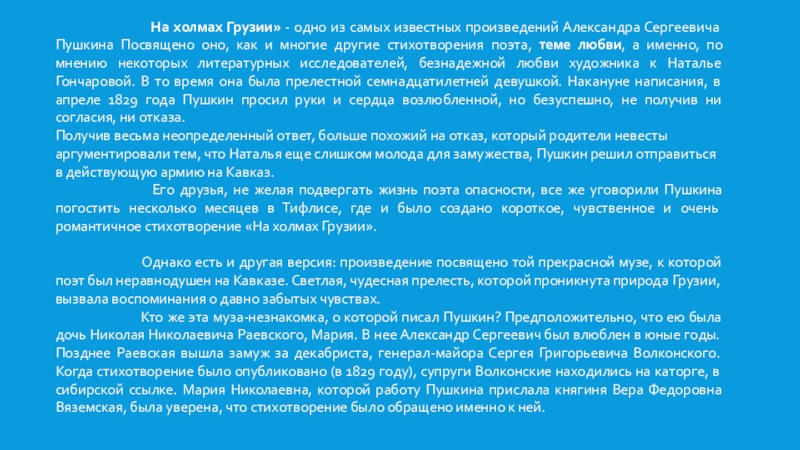 На холмах Грузии» - одно из самых известных произведений Александра Сергеевича Пушкина Посвящено оно, как и многие другие стихотворения поэта, теме любви, а именно, по мнению некоторых литературных исследователей, безнадежной любви художника к Наталье Гончаровой. В то время она была прелестной семнадцатилетней девушкой. Накануне написания, в апреле 1829 года Пушкин просил руки и сердца возлюбленной, но безуспешно, не получив ни согласия, ни отказа.