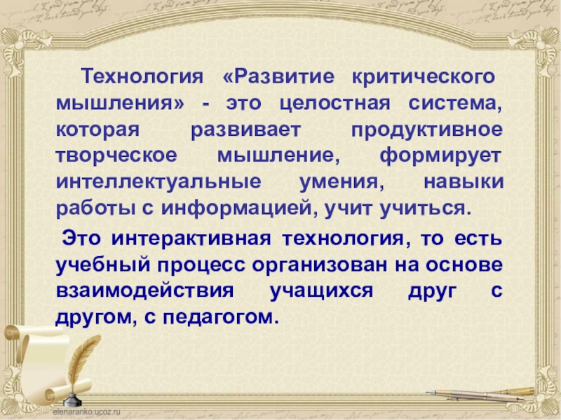 Технология «Развитие критического мышления» - это целостная система, которая развивает продуктивное творческое мышление, формирует интеллектуальные умения, навыки работы с информацией, учит учиться. Это интерактивная технология, то есть учебный процесс организован на основе взаимодействия