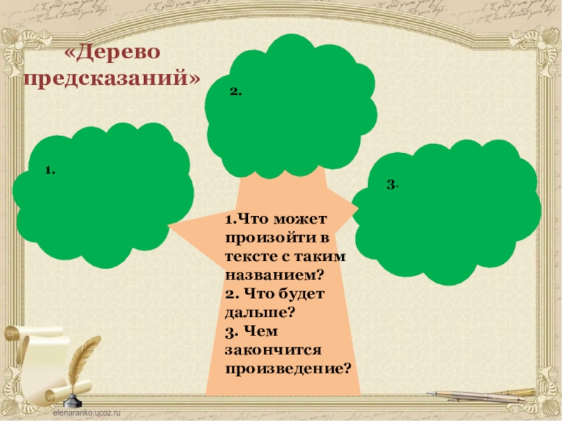 «Дерево предсказаний»1.2.3.1.Что может произойти в тексте с таким названием?2. Что будет дальше?3. Чем закончится произведение?