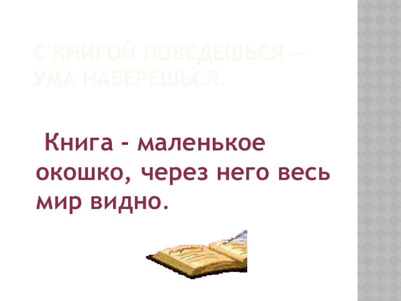 С КНИГОЙ ПОВЕДЕШЬСЯ — УМА НАБЕРЕШЬСЯ.	Книга - маленькое окошко, через него весь мир видно.