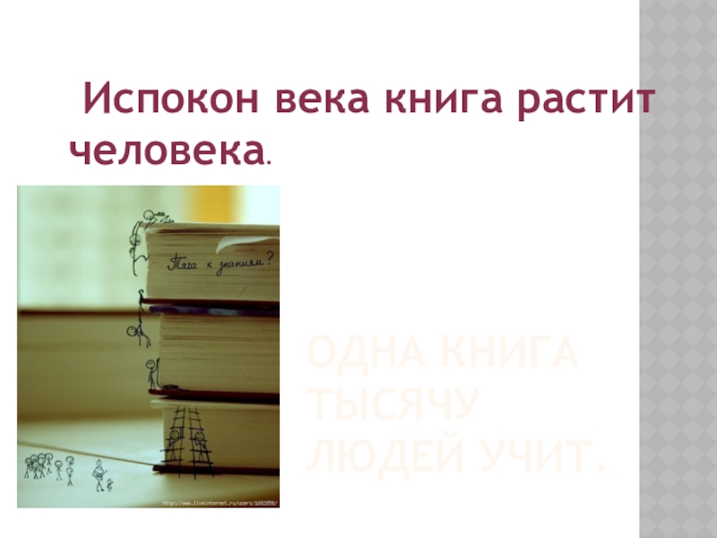 Слайд 5ОДНА КНИГА ТЫСЯЧУ ЛЮДЕЙ УЧИТ.