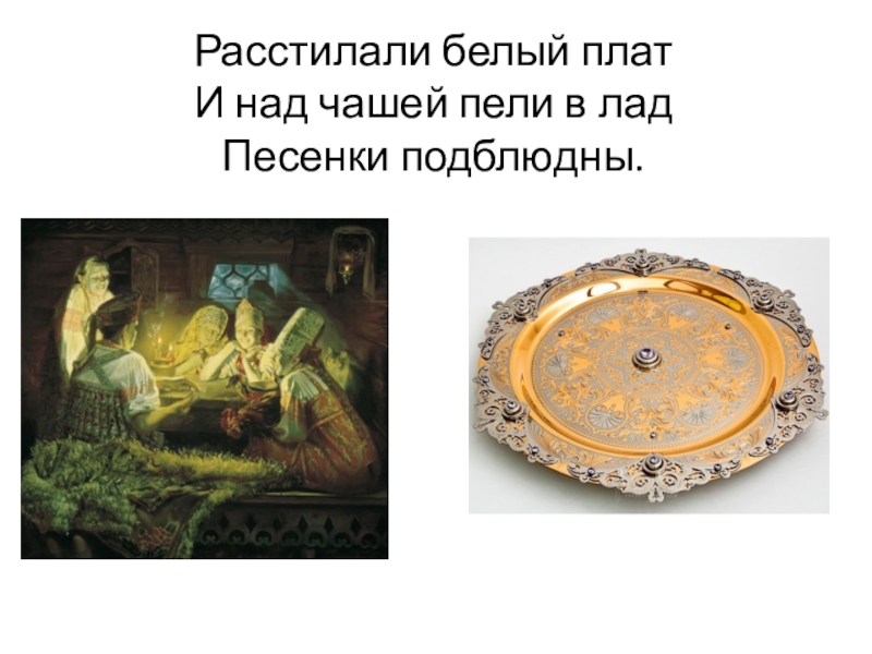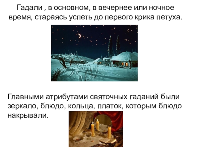 Главными атрибутами святочных гаданий были зеркало, блюдо, кольца, платок, которым блюдо накрывали.