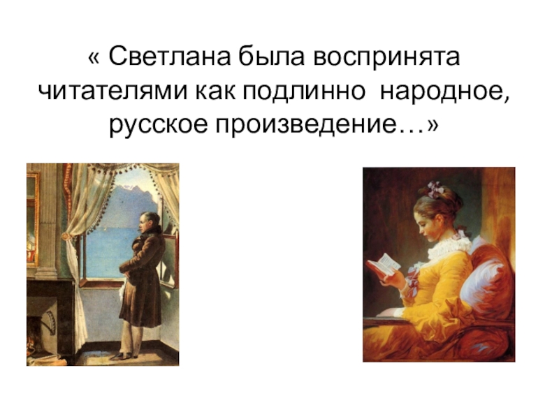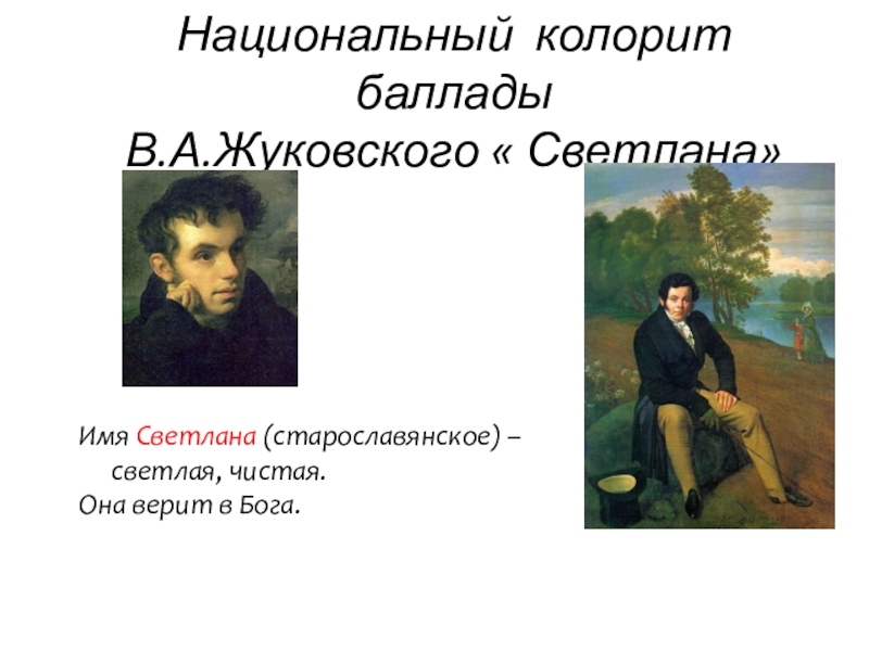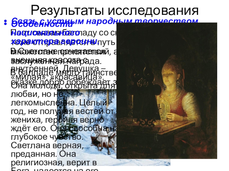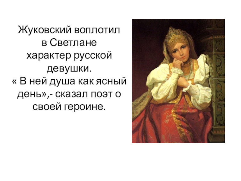 В Светлане сочетается внешняя красота с внутренней. Девушка – «милая», «красавица». Она молода, открыта для любви, но не легкомысленна. Целый год, не получая вестей от жениха, героиня верно ждёт его. Она способна на глубокое чувство. Светлана верная, преданная. Она религиозная, верит в Бога, надеется на его помощь.
