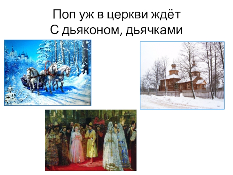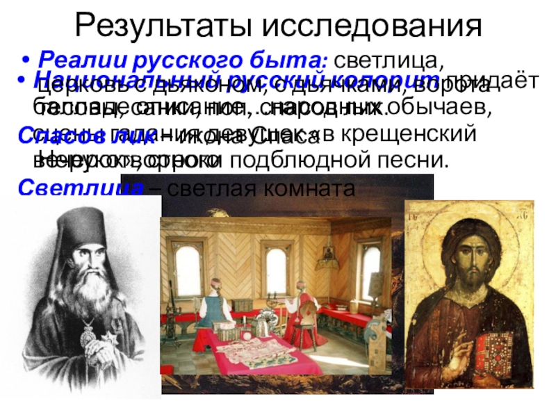 Реалии русского быта: светлица, церковь с дьяконом, с дьячками, ворота тесовы, санки, поп, спасов лик.