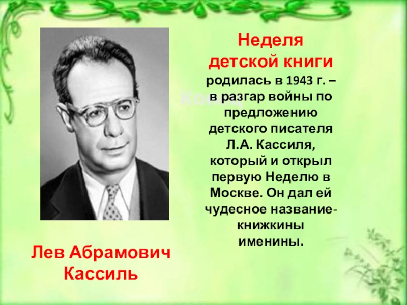 разгар войны по предложению детского писателя Л.А. Кассиля, который и открыл первую Неделю в Москве. Он дал ей чудесное название- книжкины именины.