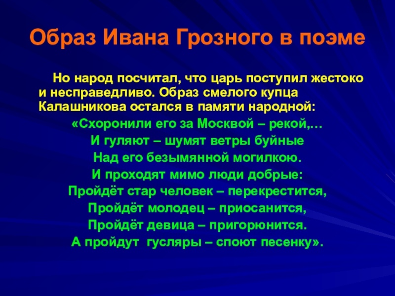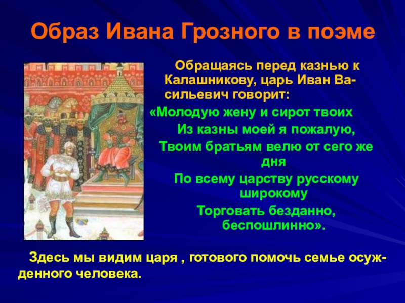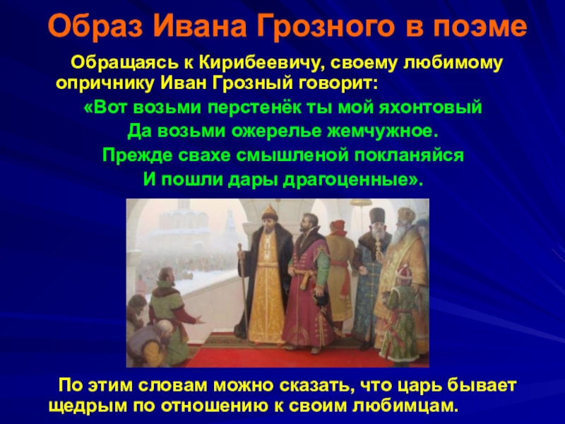изобразил царя в своём произведении «Песня про царя Ивана Васильевича, моло-дого опричника и удалого купца Ка-лашникова» как личность жестокую, но и в то же время милостивую.