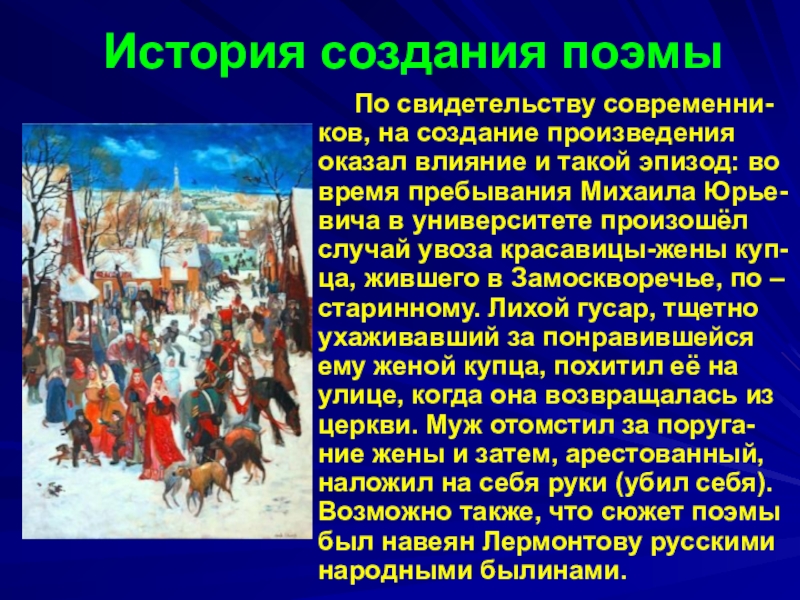 создание произведения оказал влияние и такой эпизод: во время пребывания Михаила Юрье-вича в университете произошёл случай увоза красавицы-жены куп-ца, жившего в Замоскворечье, по – старинному. Лихой гусар, тщетно ухаживавший за понравившейся ему женой купца, похитил её на улице, когда она возвращалась из церкви. Муж отомстил за поруга-ние жены и затем, арестованный, наложил на себя руки (убил себя). Возможно также, что сюжет поэмы был навеян Лермонтову русскими народными былинами.