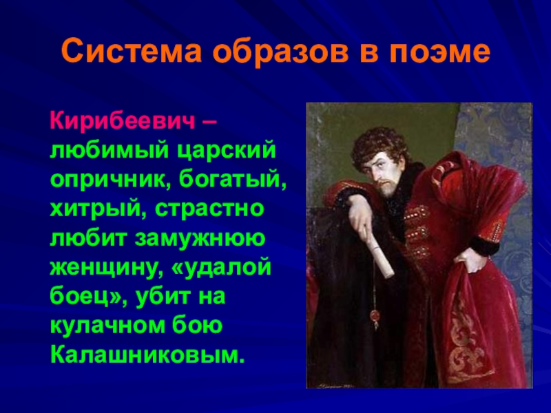 хитрый, страстно любит замужнюю женщину, «удалой боец», убит на кулачном бою Калашниковым.