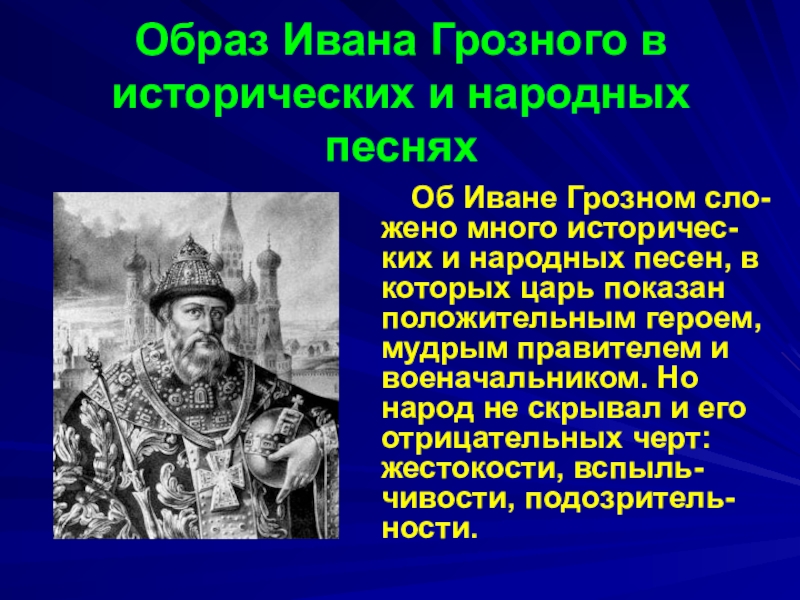 Об Иване Грозном сло-жено много историчес-ких и народных песен, в которых царь показан положительным героем, мудрым правителем и военачальником. Но народ не скрывал и его отрицательных черт: жестокости, вспыль-чивости, подозритель-ности.
