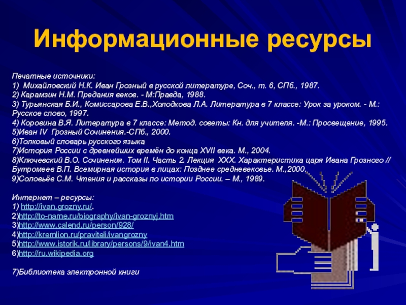 8)Ключевский В.О. Сочинения. Том II. Часть 2. Лекция XXX. Характеристика царя Ивана Грозного // Бутромеев В.П. Всемирная история в лицах: Позднее средневековье. М.,2000.